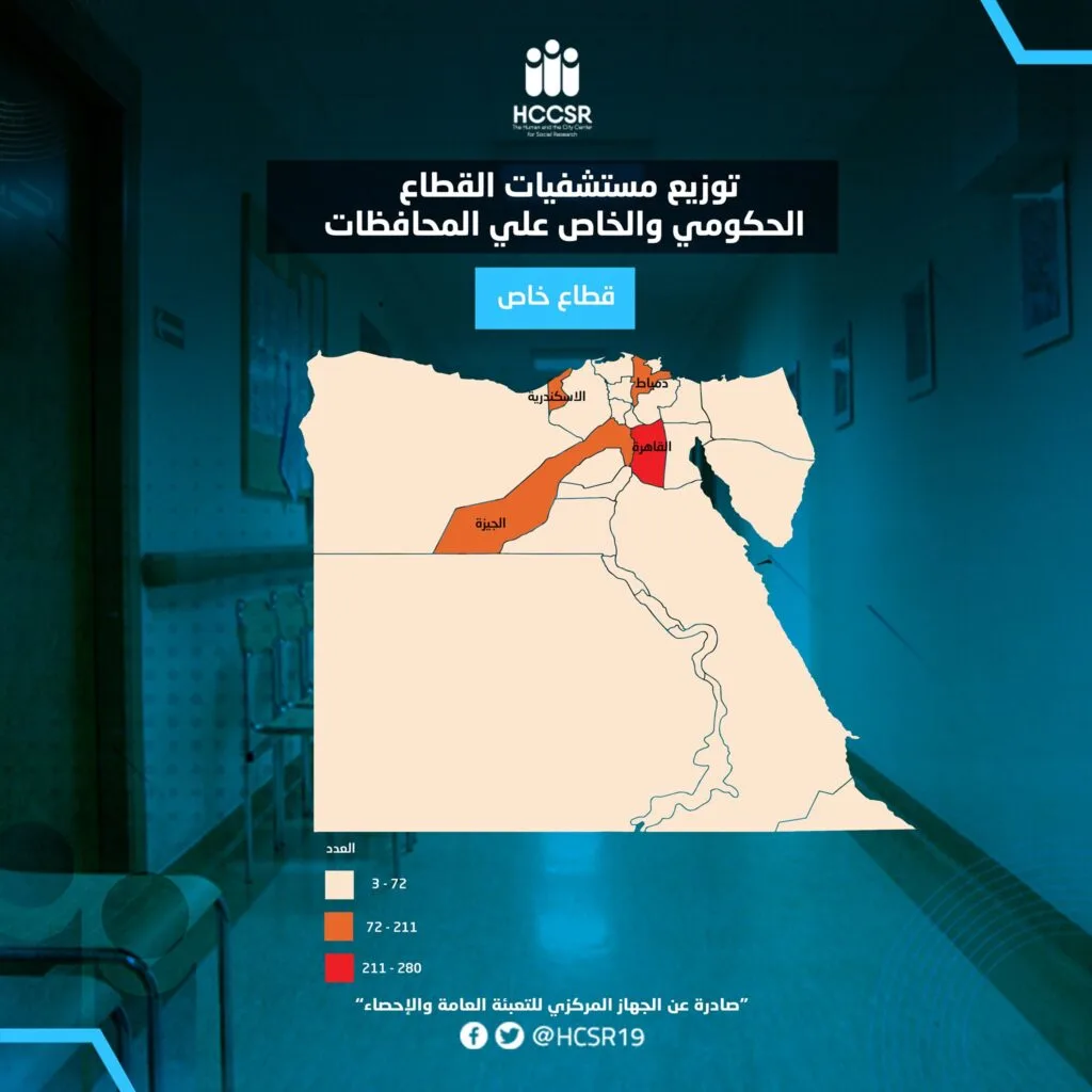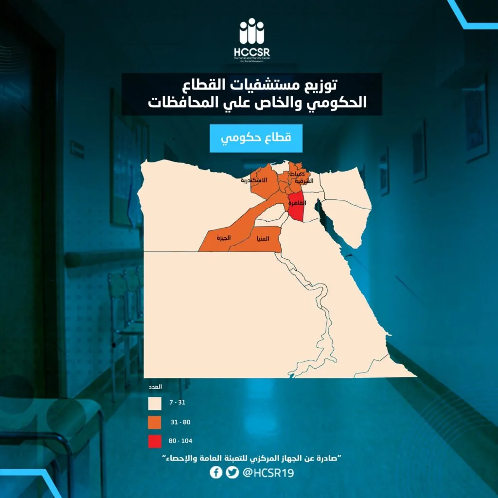 تشير الخرائط الصادرة عن الجهاز المركزي للتعبئة والإحصاء إلى عدم المساواة فى التوزيع الجغرافي للخدمات الصحية الحكومية على مستوى الجمهورية؛ فتم تقسيم محافظات مصر إلى ثلاث فئات وفقًا لعدد المستشفيات. الفئة الأولى من المحافظات وهي صاحبة أكبر عدد من المستشفيات و تستحوذ عليها محافظة القاهرة وحدها بإجمالي 104 مستشفى.